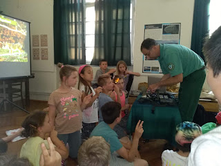 Csütörtökön délelőtt a hagyományos rovarkutató programunk keretében ezúttal Mecsekszabolcsra látogattunk el múzeumunk zoológusával, és a füves domboldalon gyönyörú lepkefajokat, szöcskéket, sáskákat és néhány bogárfajt is találtunk és megfigyeltünk. A korszerű technikát ezen a napon a hanrögzítő készülékek képviselték, melyekkel felerősíthettük és azonosíthattuk a fúben hallott rovarok hangját.